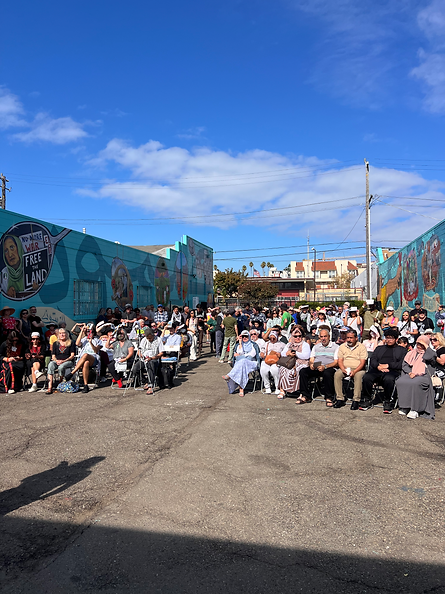 The SUMUD: RESISTANCE UNTIL LIBERATION MURAL at Uptown Auto Body in Oakland, California is a 5,000 sq ft community mural on 3 perpendicular walls of a publicly accessible parking lot. The mural involved dozens of Bay Area organizations, including Palestinian-led and Palestine solidarity groups, an Indigenous Ohlone land trust, prison abolitionist groups, and more. The content was designed and painted by local, international, and incarcerated artists, including hundreds of community members as well as legends like Black Panther Minister of Culture Emory Douglas and artists from Gaza and the West Bank.